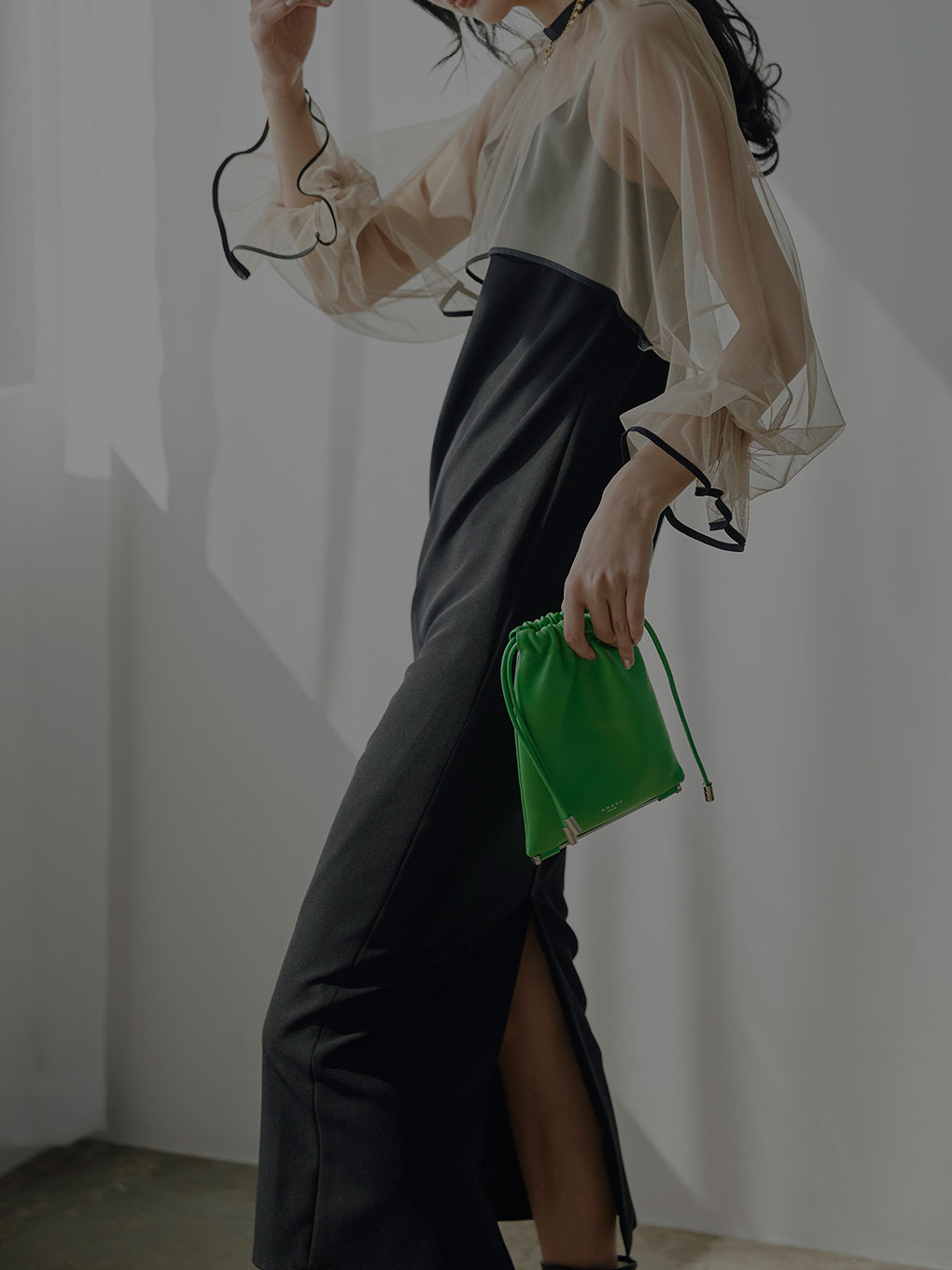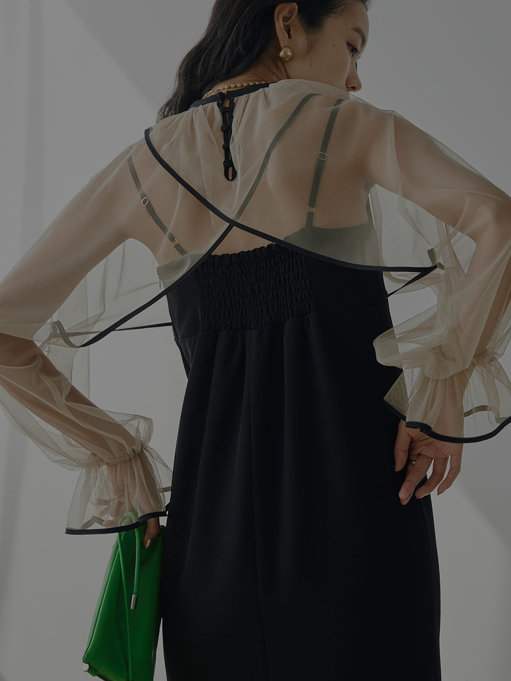Iラインの美シルエットなドレスと、シアーなチュールトップスの相性が抜群。