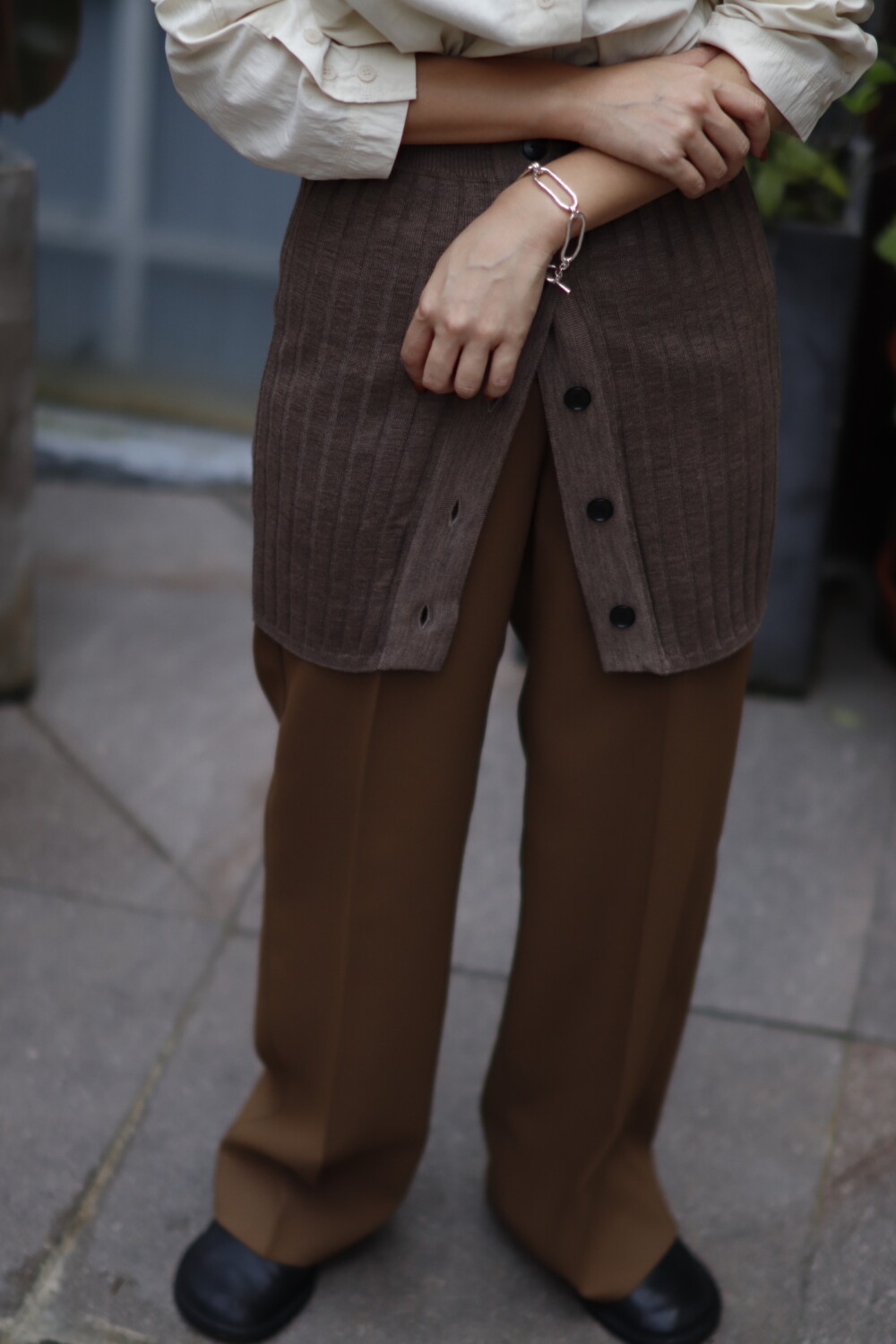 ニットとの異素材合わせが魅力のレイヤードパンツ。
