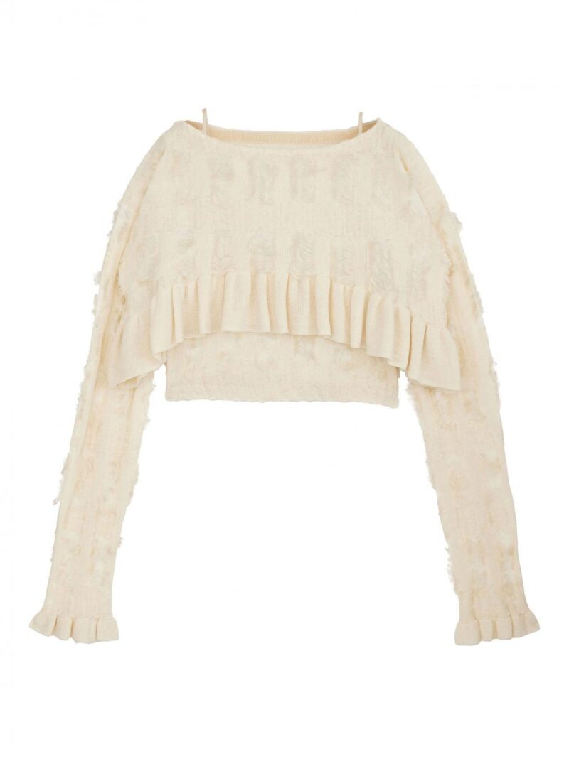 フリンジの編み地がポイントの、キャミソールトップスとショートトップスがセットになったマルチウェイニット。