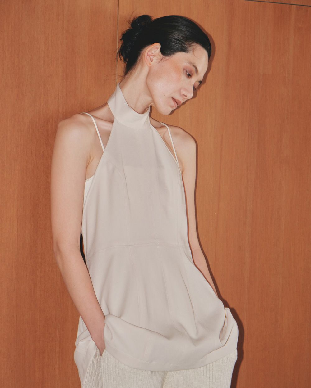 ホルターネックが肩のラインを華奢に見せてくれるので