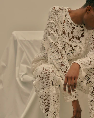 クロシェットレースをふんだんにパッチワークしたレースロンT。