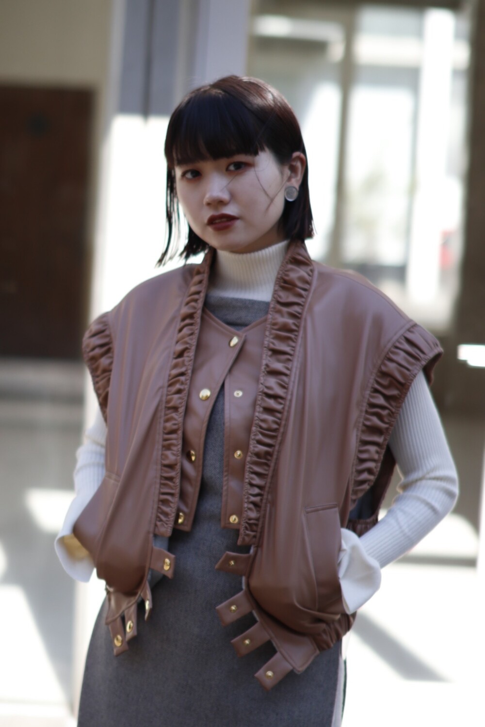 ベストのデザインがシンプルな色味のコーデにアクセントを加えてくれます。