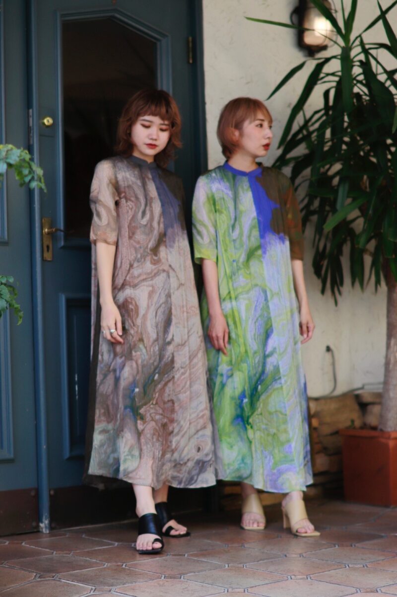 シワ加工が入ったオリジナルアート柄ワンピース。