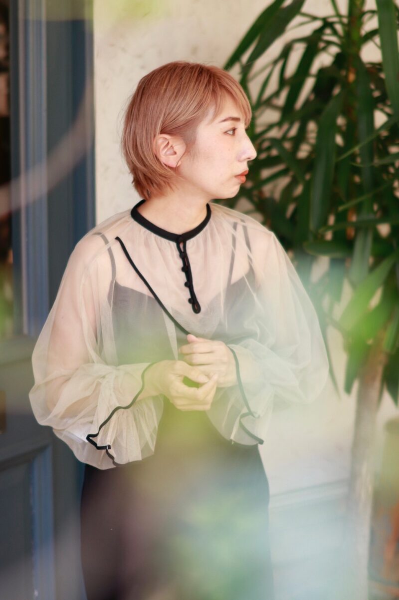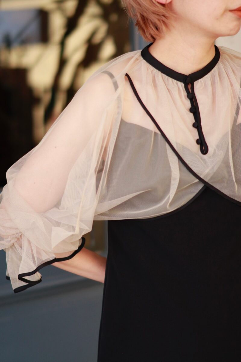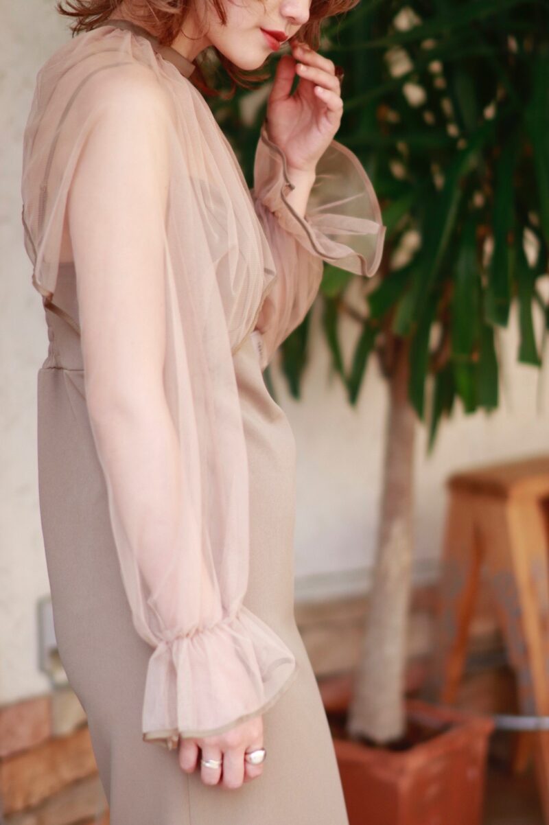 シアーの袖が気になる二の腕周りをカバーし、背中の開きが女性らしく目を引きます。