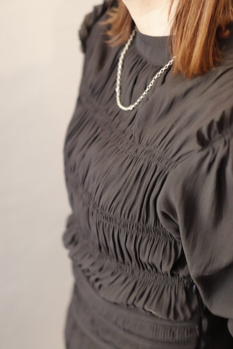 身頃全面にシャーリング、ウエストパーツにプリーツを施してあります。