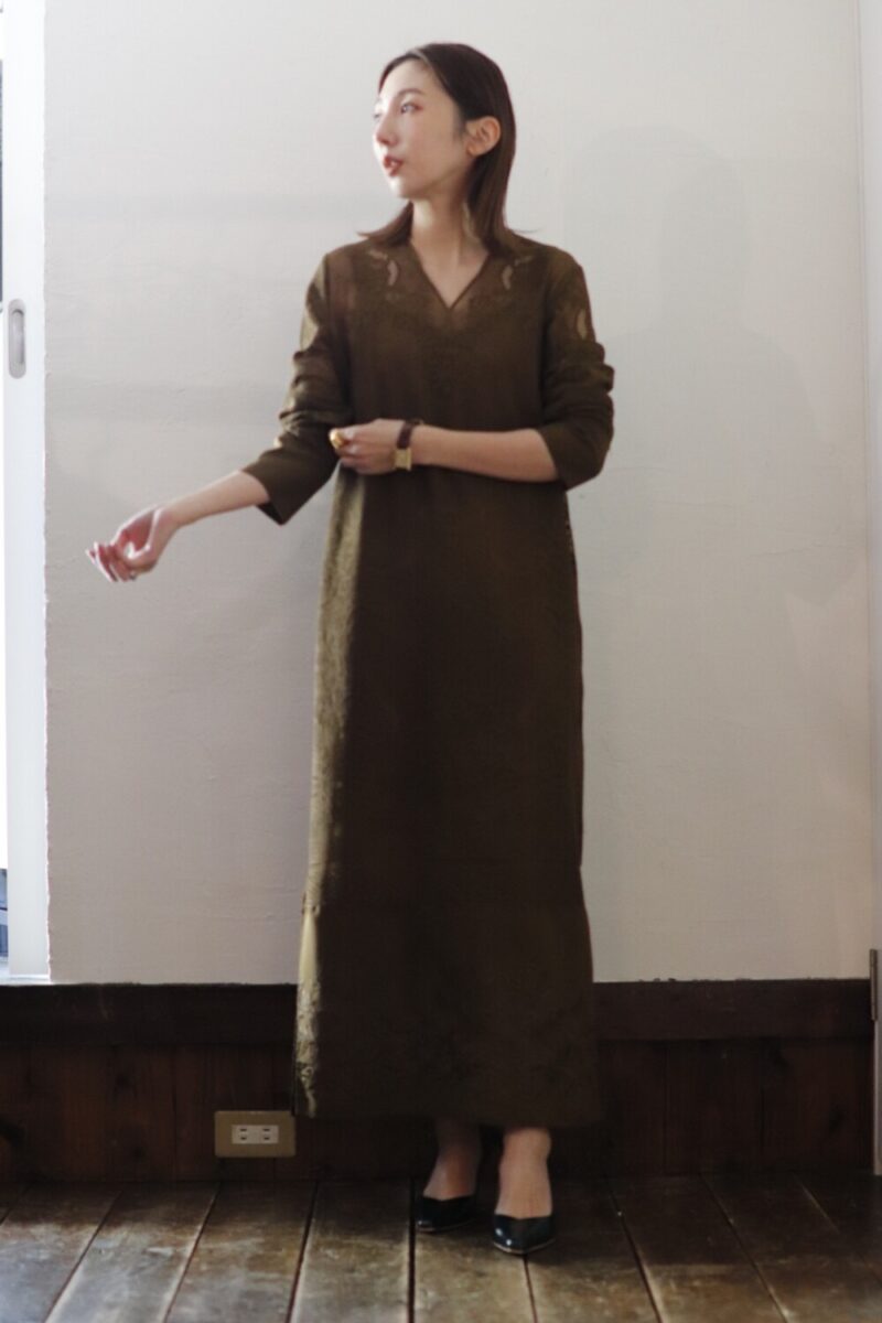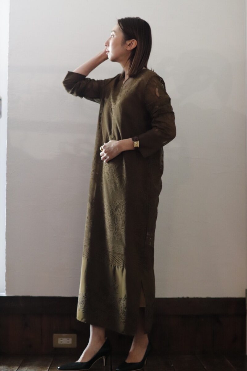 裾は異素材で切り替え、刺繍を施し洗練されたデザインが目を引きます。
