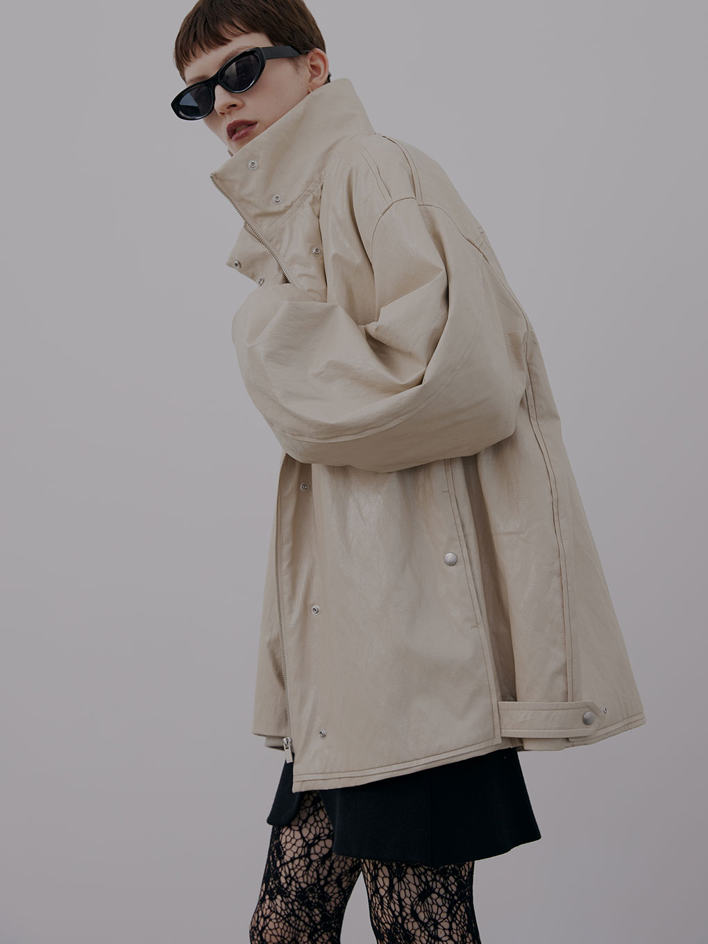 裾の両サイドにスナップボタンを付けているため、ボトムによってシルエットを変えることが可能。